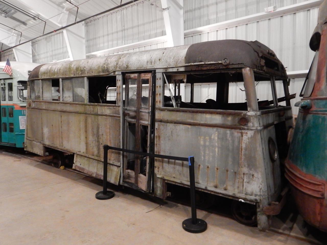 Arlington & Fairfax Railway "Auto-Railer" 109 was designed in 1935 and built in 1936 by the Evans Products Company of Detroit as a hybrid bus/railcar with retractable steel wheels to run on rails and rubber tires to run on roads. It initially interested several interurbans and shortlines but was short-lived in revenue passenger service. The Arlington & Fairfax Railway in northern Virginia wanted to compete with Capital Transit streetcars, but Capital Transit had the rights to cross the Potomac River into Washington DC and the A&F was blocked by injunction. After the A&F went out of business in 1939, Auto-Railer 109 was sold to the Arcade & Attica Railroad in New York. It later sat at Clark’s Trading Post in New Hampshire until it was brought to the National Capital Trolley Museum in Maryland in 2024. I saw this “hi-rail” bus on temporary display at the museum before it went to the museum workshop for restoration.