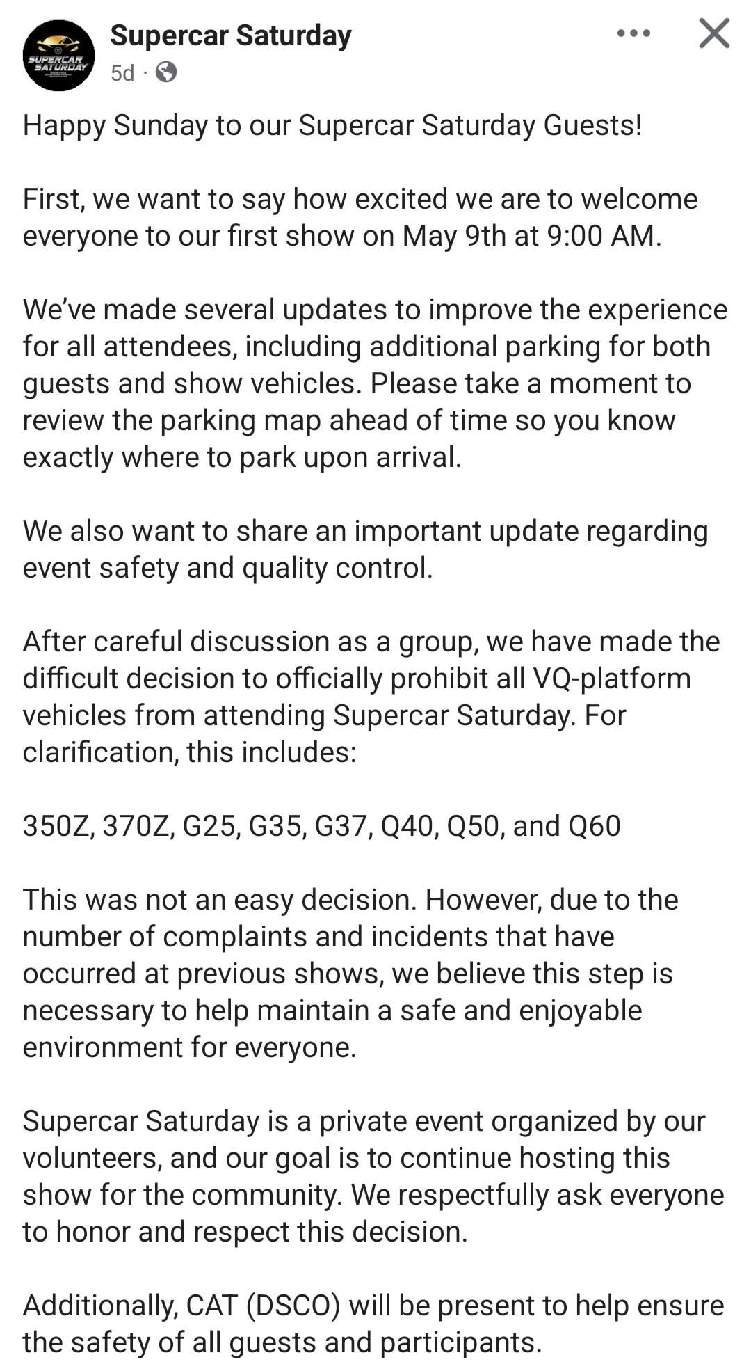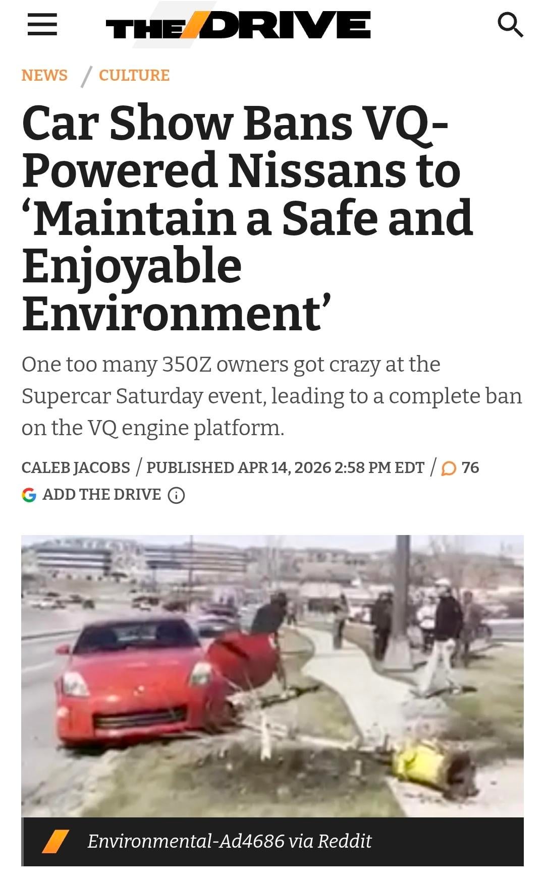 Car meet in Omaha, Nebraska bans Nissan cars powered by VQ V6 engines (350/370Z, Infiniti G-Cars, etc.)by HiTork regular car reviewsRegular CarsRelated Posts Bricklin SV-1: Wedge-Shaped Silhouette That Masked Uncompromising Emphasis on Passive Protection April 18, 2026 1999 Packard Twelve April 18, 2026 Porsche 911 GT3 Touring [3409×3409] April 18, 2026 [Ford GT] Randomly seen at a small local SCCA race April 18, 2026 i am now the proud owner of a 500k mile L61 f23 ecotec hhr April 18, 2026 [multi] Daikoku Parking Area April 18, 2026
