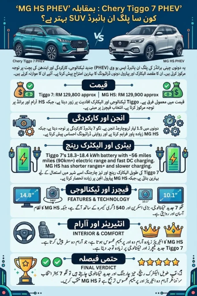 The MG HS PHEV vs Chery Tiggo 7 PHEV comparison shows that both SUVs offer strong value with different strengths. The Tiggo 7 stands out for its electric range, fast charging, and advanced technology.